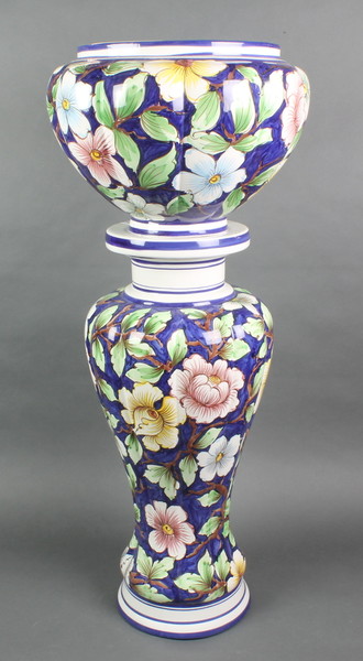 A contemporary Continental polychrome jardiniere and stand decorated with flowers
