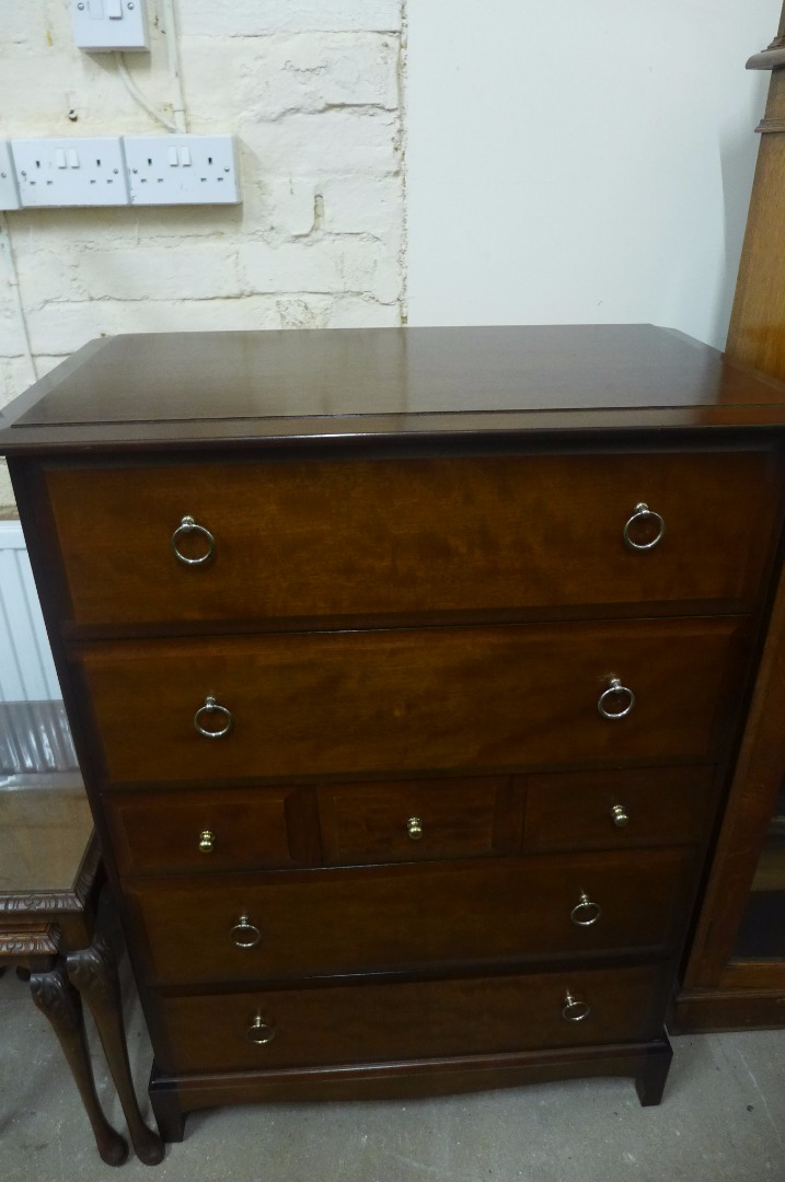 A contemporary mahogany stag chest of drawers with an arrangement of seven drawers with metal drop handles on a shaped plinth