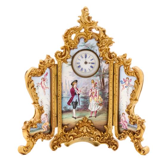 A Continental Enamel and Gilt Metal Three Panel Table Clock