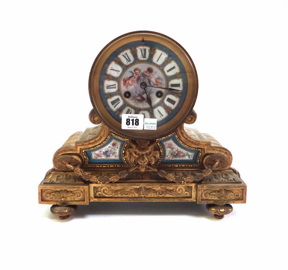 the drum case with porcelain dial painted with cherubic figures over a stepped plinth base inset with foliate decorated porcelain plaques and cast with lions mask and floral swags, on shaped feet, with a two train movement