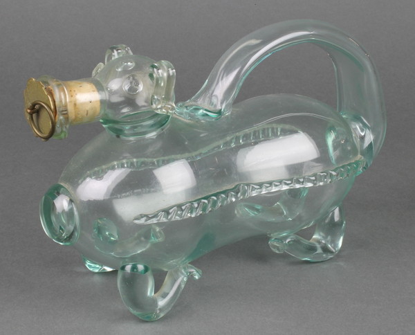 A Continental glass decanter in the form of a standing dog with metal mounted cork stopper