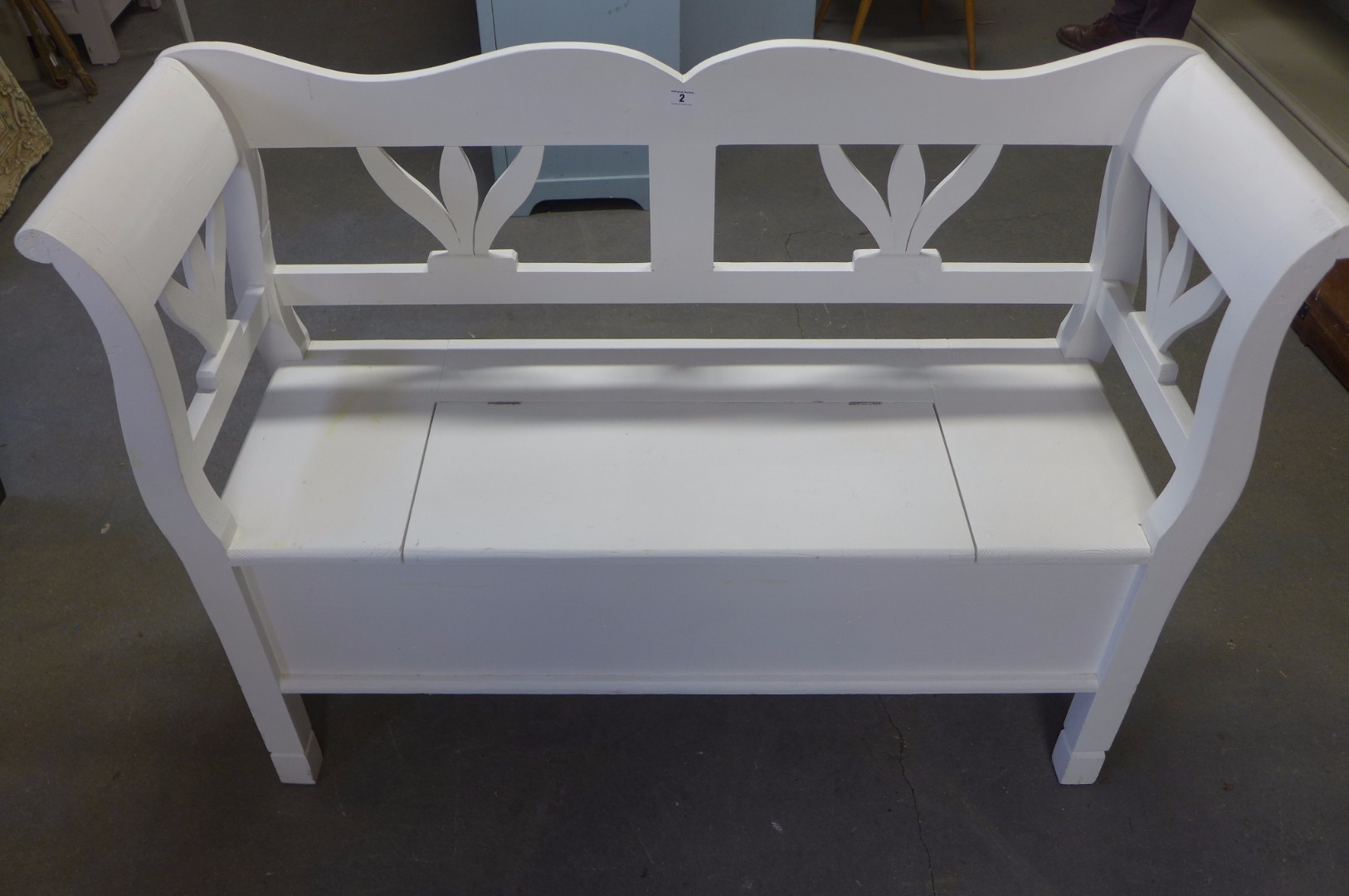A Continental style painted bench with carved arms and supports, lift up seat on square tapering legs
