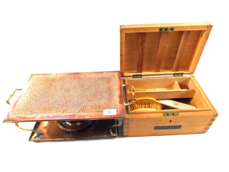 A Copper food warmer and a Pine box containing Ivory brushes etc