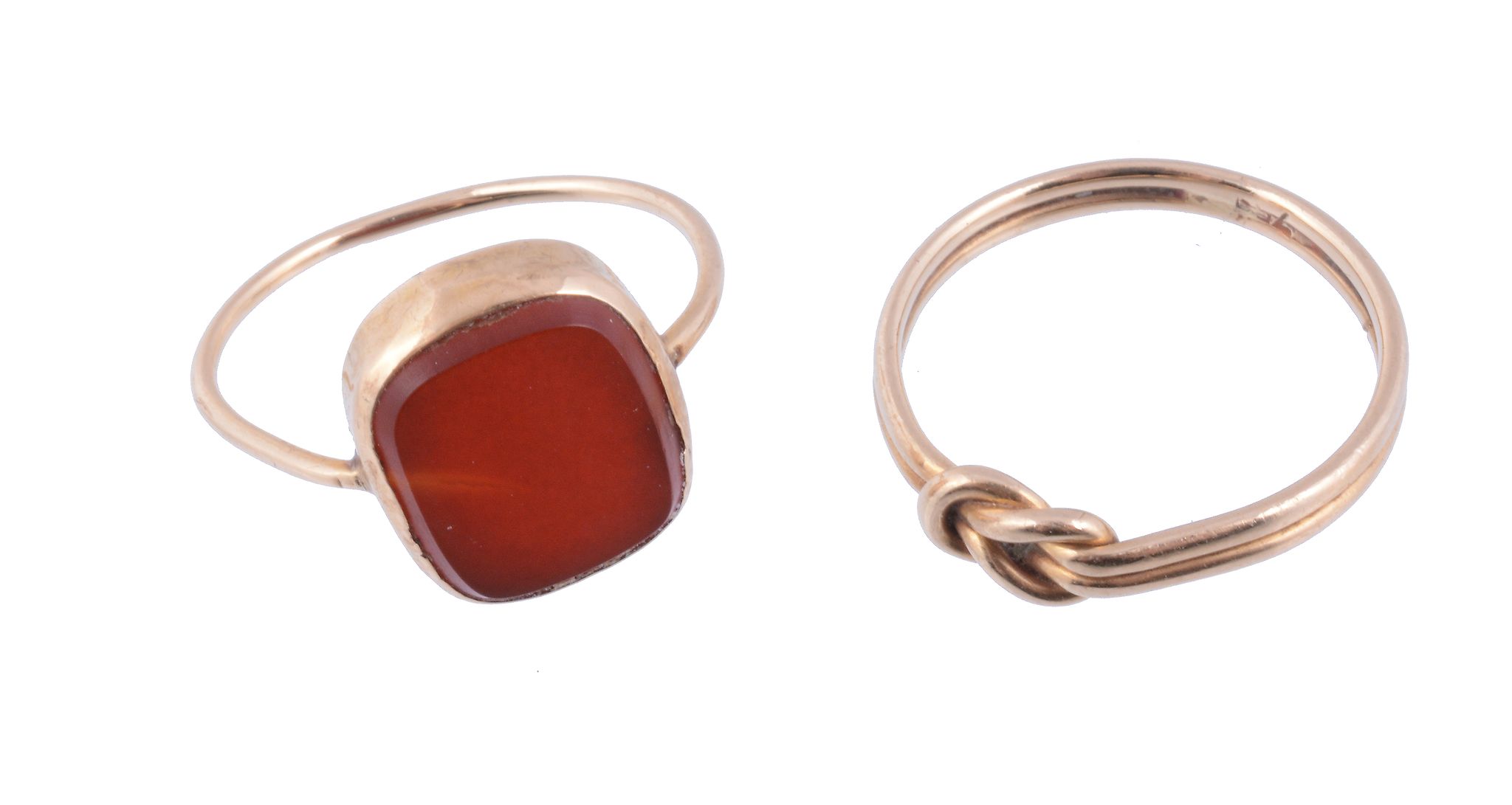 the rectangular shaped cornelian panel in a collet setting, finger size K 1/2; a ring, with central knot motif, finger size L 1/2