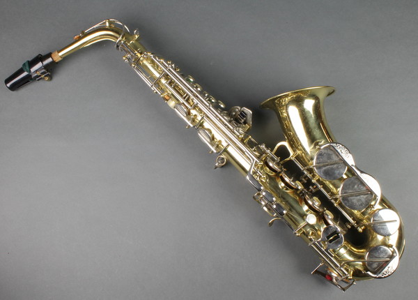 A Corton brass saxophone in a carrying case