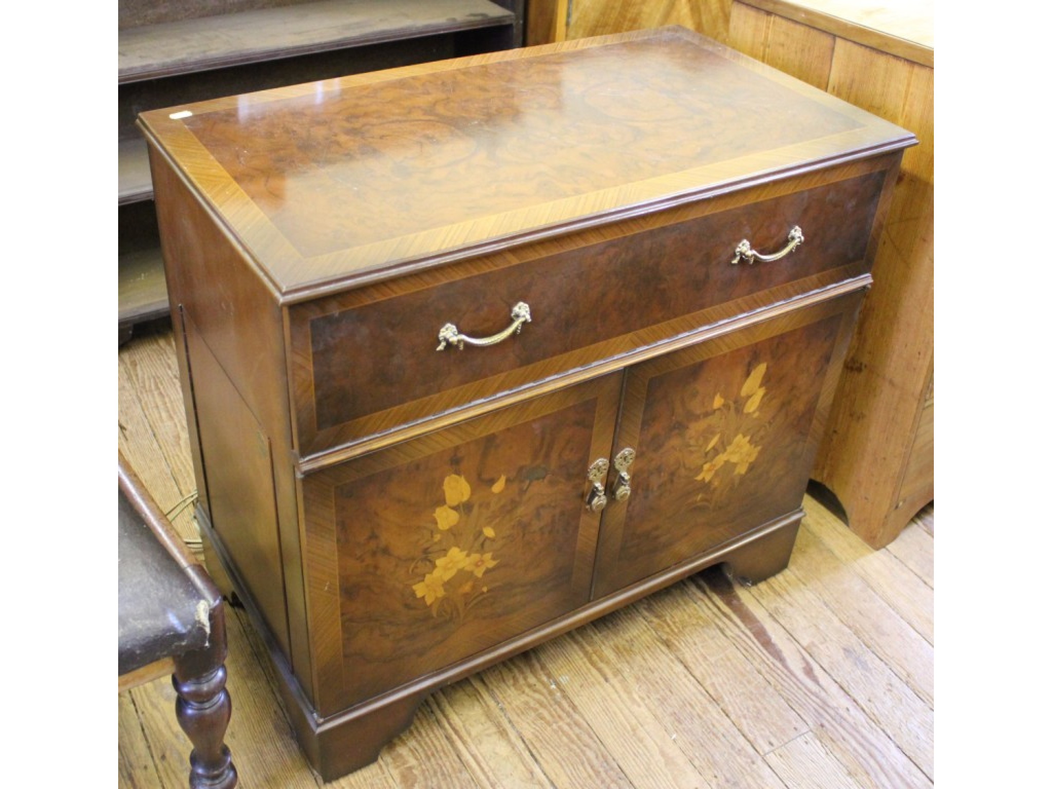 A cross banded walnut veneered and inlaid hifi cabinet, containing a Garrard hifi system
