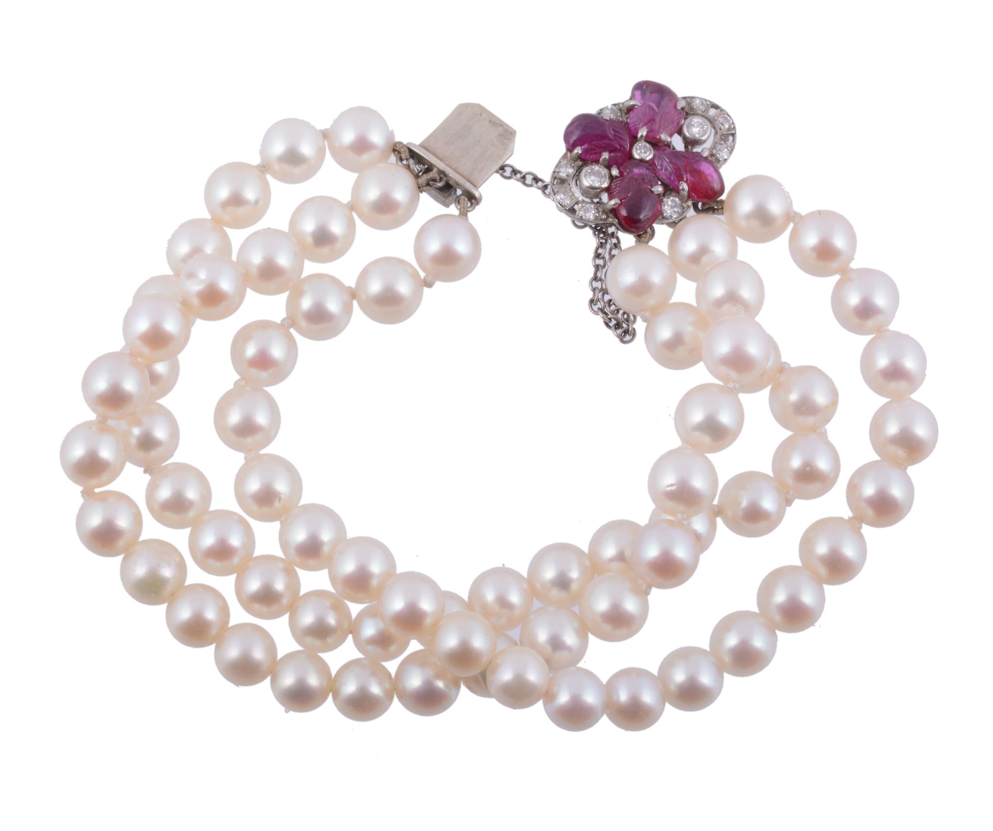A cultured pearl bracelet with a diamond and ruby clasp