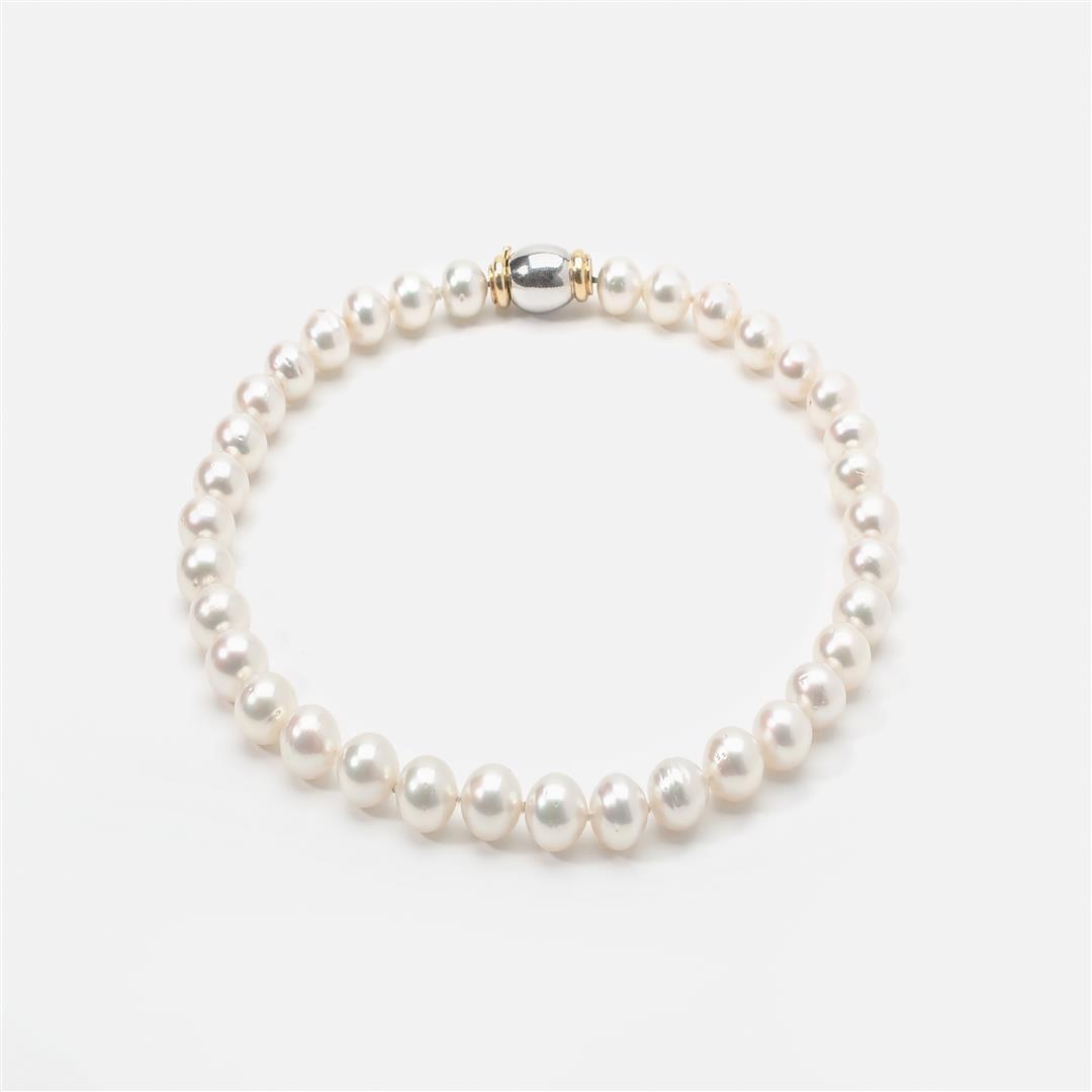 Graduating light round to Baroque white South Sea cultured pearls terminating in an 18 carat yellow and white gold clasp. Pearls measuring approx. 10.24 - 12.74 mm L. 42 cm / 16.5 in Gross weight approx. 75 g Pearls not tested