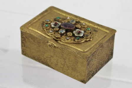 A CZECH TOOLED BRASS BOX set with amethyst together with a filigree silver gold coloured metal BRACELET and NECKLACE, 40cm long
