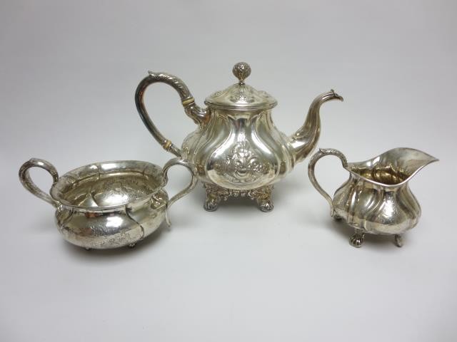 A Danish silver three piece circular Tea Service with floral embossing, shaped feet, flower finial to teapot, maker: P Hertz, Copenghagen