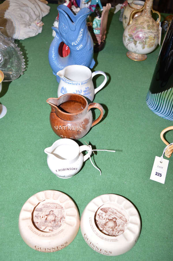 A Dartmouth pottery Devon gurgling fish jug advertising Plymouth Gin; a Crawford Scotch Whisky jug with 'Willow' pattern; a Watneys Ale brown glaze jug; a Robinson's Best Mild jug by Minton; and a pair of Guinness ashtrays.