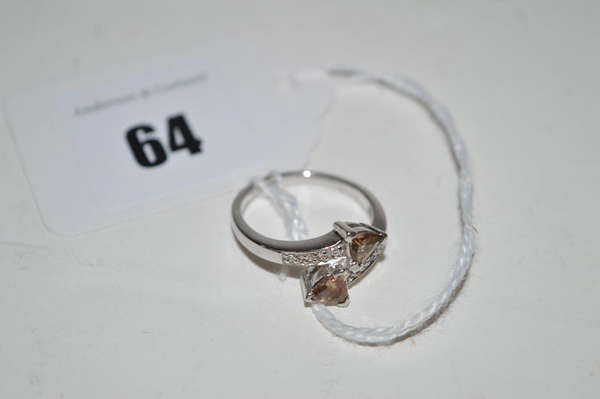 A diamond and brown stone (probably topaz) ring, the trilliant cut stones flanked by diamond shoulders, on 9ct. white gold shank, ring size N.