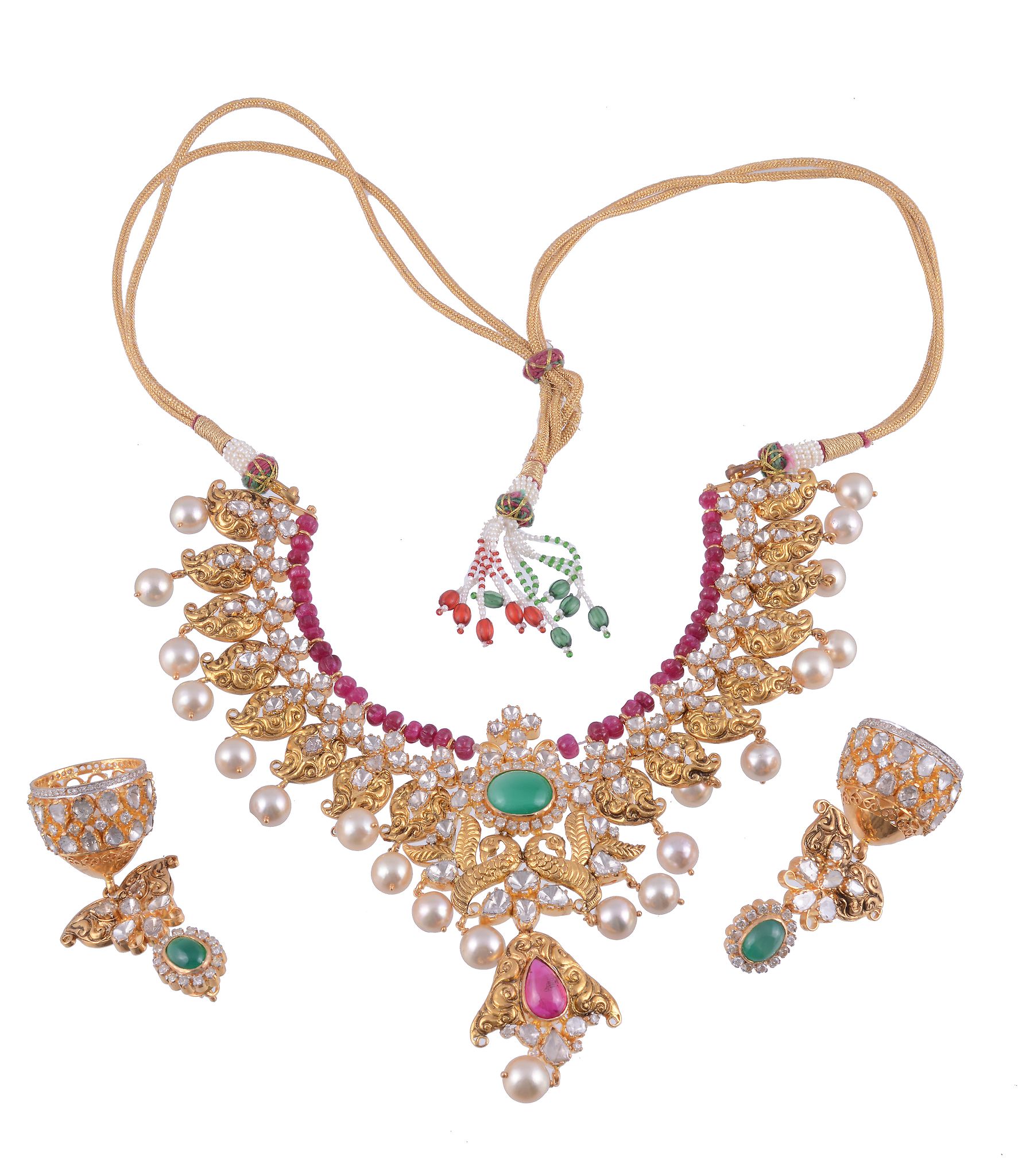 the necklace with scrolled foliate panels set with lasque cut diamonds, stamped 916, suspending cultured pearl drops, with red and green stone accents, to a cord necklace; together with a pair of lasque cut diamond set ear bell drop ear pendants, 208