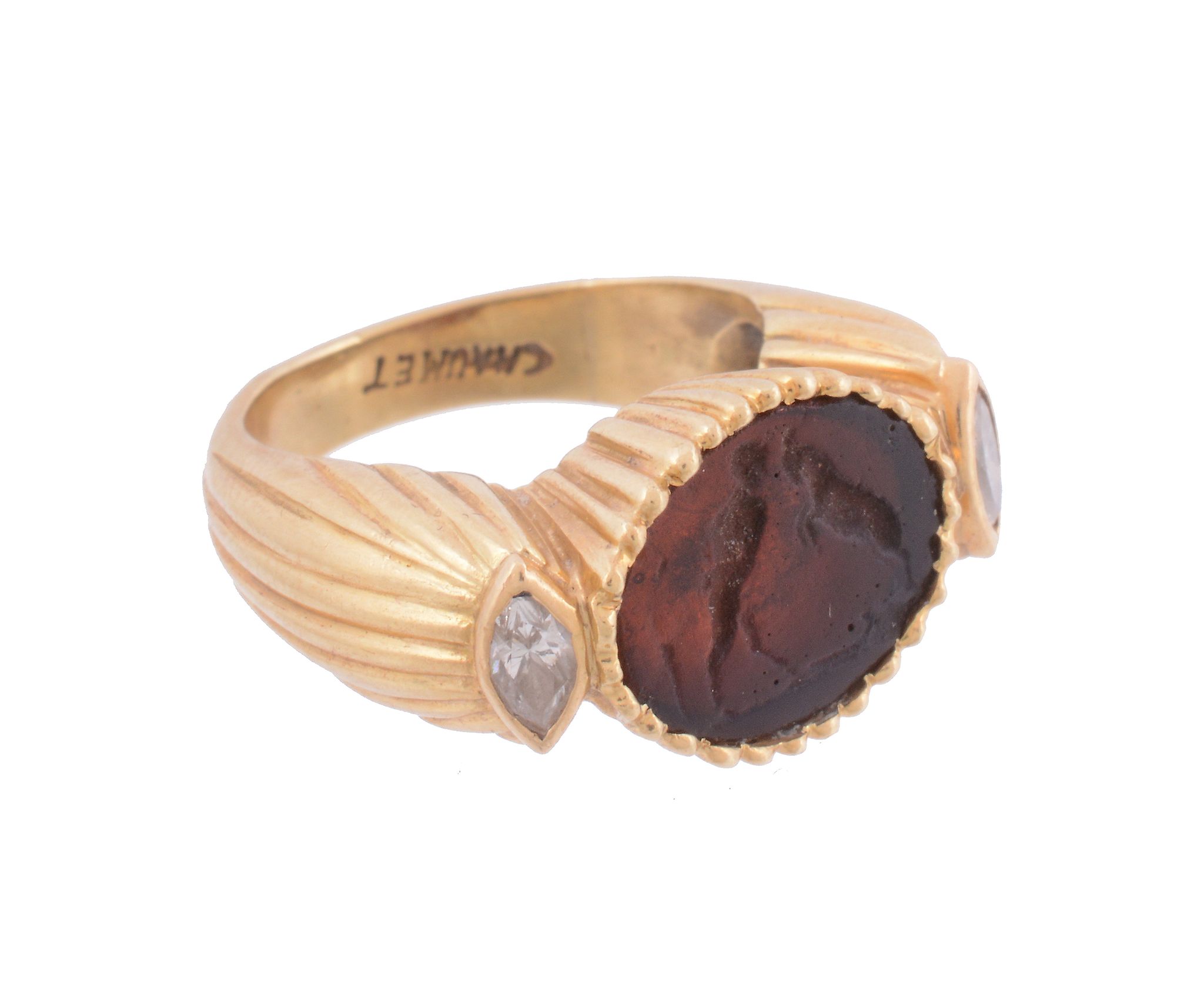 the brown paste panel with a satyr fighting a goat, between marquise cut diamonds, to a reeded setting, the shank stamped Chaumet, finger size K 1/2