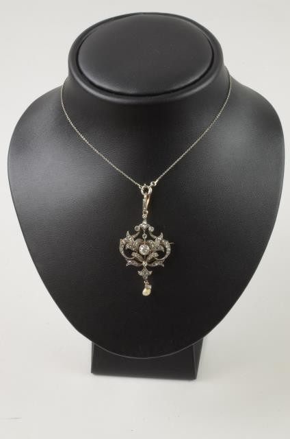 and rose-cut diamonds in openwork plaque suspending single pearl backed with gold