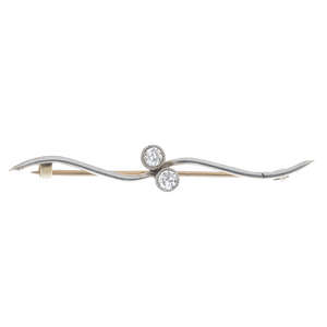 Comprising two circular-cut diamond collets, set either side of the scrolling bar. Estimated total diamond weight 0.20ct. Length 5.2cms. Weight 2.7gms.
