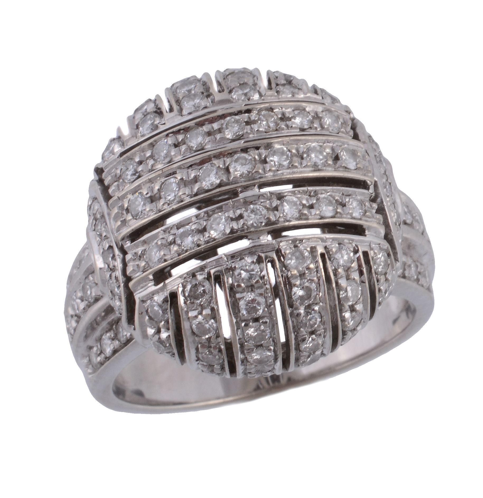 the pierced domed panel set throughout with brilliant cut diamonds, stamped 750, finger size O 1/2