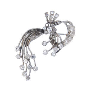The single-cut diamond cluster, with similarly-cut diamond terminal fronds, gathered by a single-cut diamond ribbon. One diamond deficient. Estimated total diamond weight 0.85ct. Length 4.2cms. Weight 8.8gms.