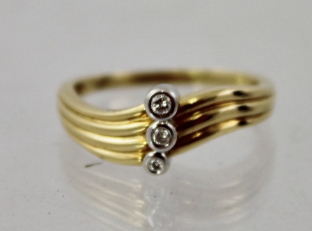 having three rub over set diamonds in white gold coloured metal and triple strand swept shank, stamped .750, size O1/2