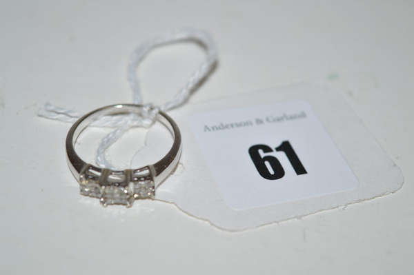 A diamond ring, each square plaque set with nine princess cut diamonds (one missing one stone), approximately 0.25 carats gross, on 9ct. white gold shank, ring size O.