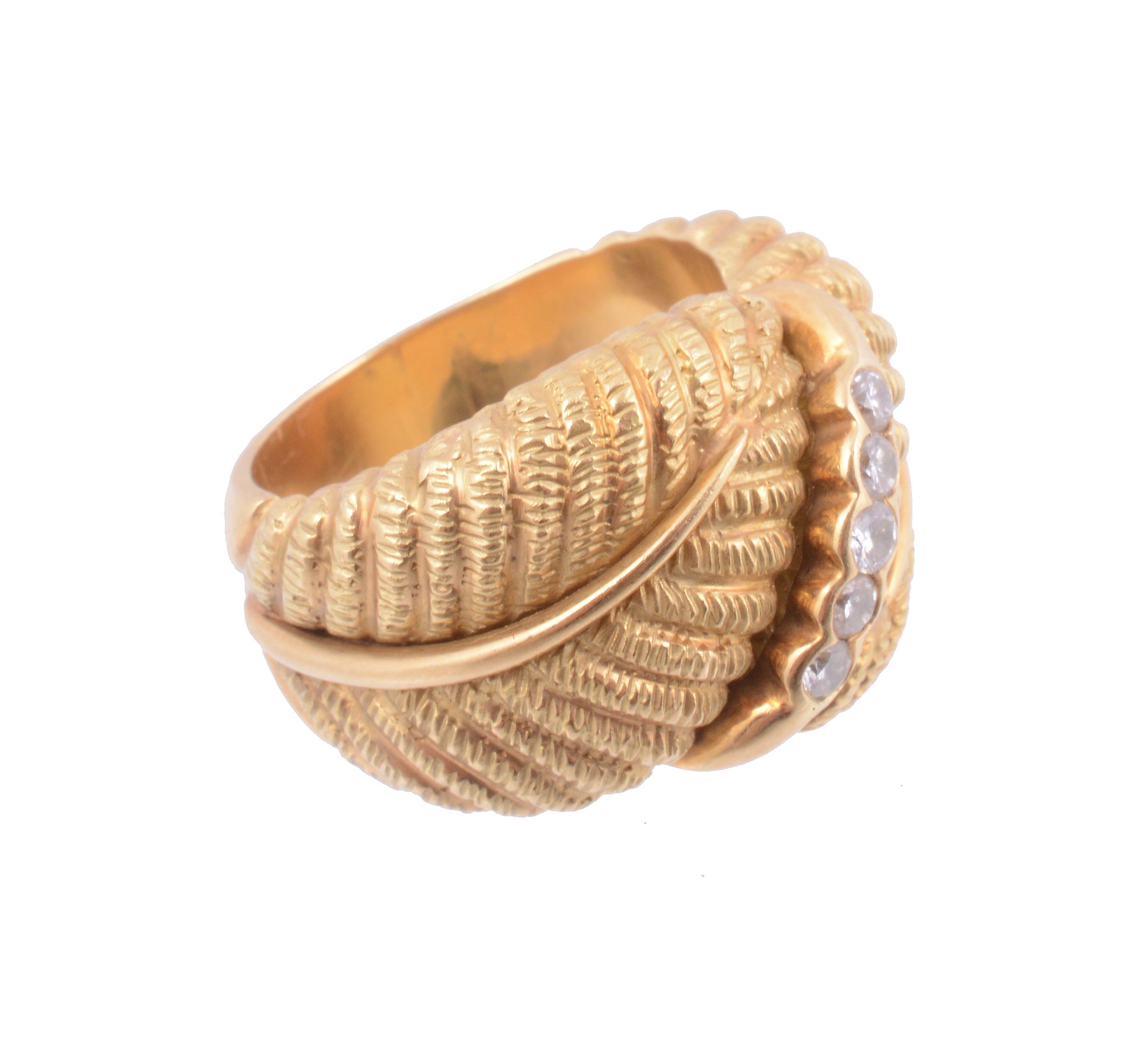 the two textured leaves in a crossover design with a diagonal row of brilliant cut diamonds between, stamped 750 with Italian control mark, finger size P