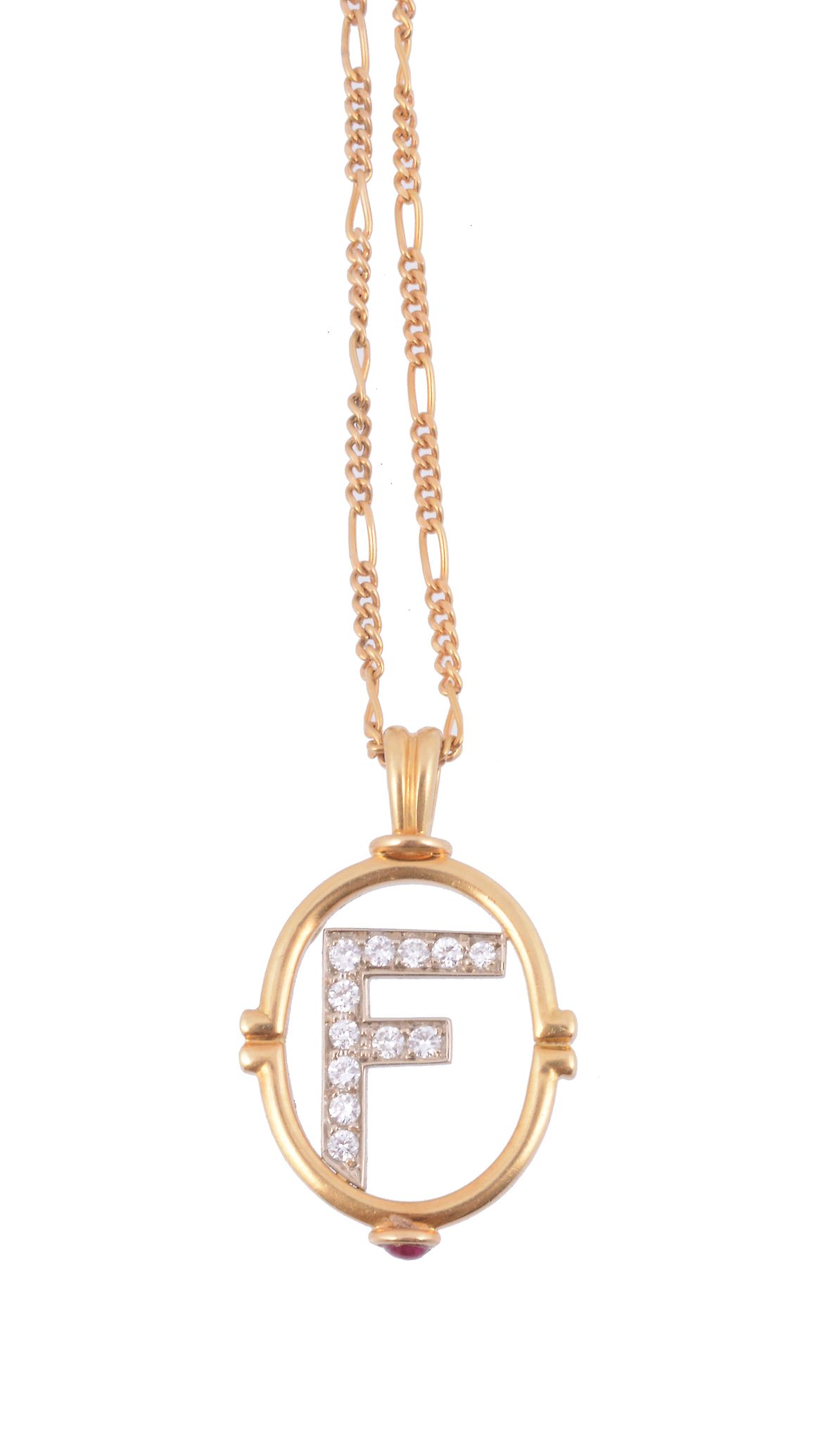 A diamond set pendant on chain, the diamond set 'F' within an oval surround with a circular cabochon ruby accent, stamped 750 wi