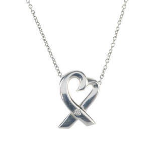 The fine-link chain suspending a heart shape crossing over to the bottom and set with a single diamond. Signed T & Co. Paloma Picasso. Length 42cms. Weight 2.8gms. With maker's pouch.