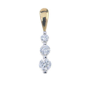 A diamond three-stone pendant. The graduated brilliant-cut diamond line, to the tapered surmount. Estimated total diamond weight 0.20ct. Length 1.7cms. Weight 0.6gms.