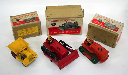 A DINKY SUPERTOYS BLAW KNOX BULLDOZER NUMBER 561 in red paint and within a cardboard box with red and white printed label together with a Dinky Supertoys dumper truck number 562 in yellow with original box and a Dinky Supertoys number 563 heavy tract