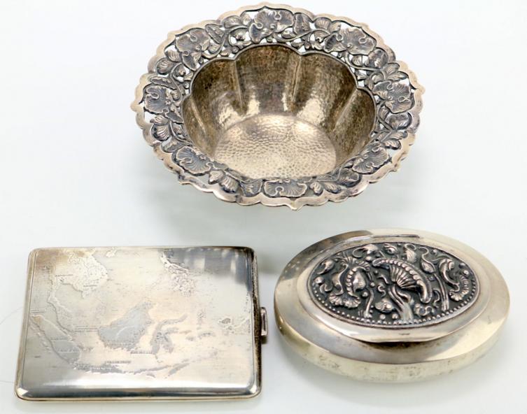 A round lobed bowl with openwork edge of lotus decor. Marked PH800. D. about 14 cm. The oval box with smooth edge and incident lid with decoration of lotus flowers, 800. PI noticed the cigarette case with decor from the card including Thailand and In