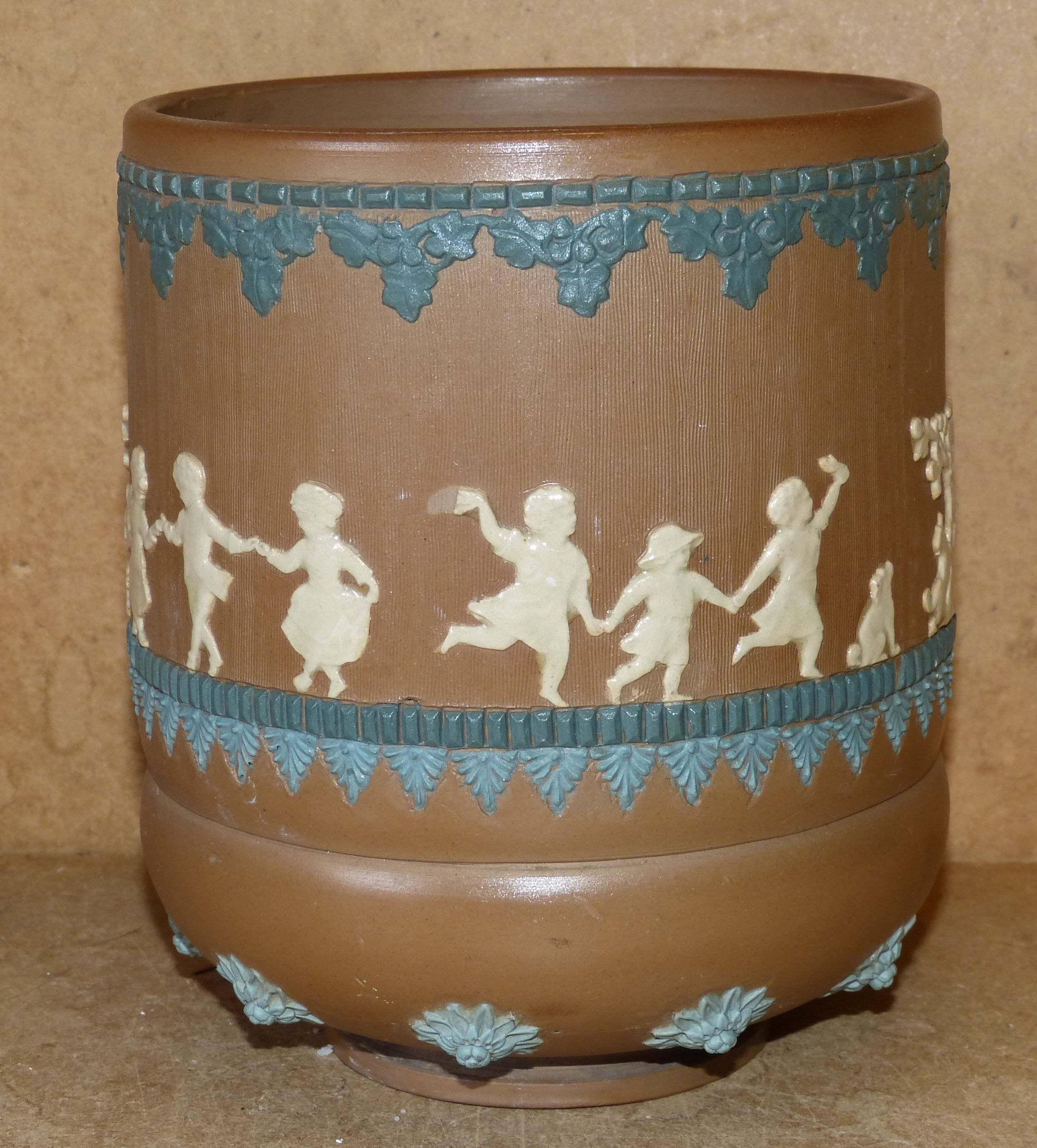 A Doulton Lambeth Bulbous Jardiniere on brown ground having raised children playing