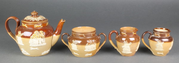A Doulton Lambeth stoneware tea set comprising 2 jugs, a sugar bowl and a teapot with lid