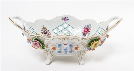 A Dresden Footed Bowl of oval form with applied flower decoration