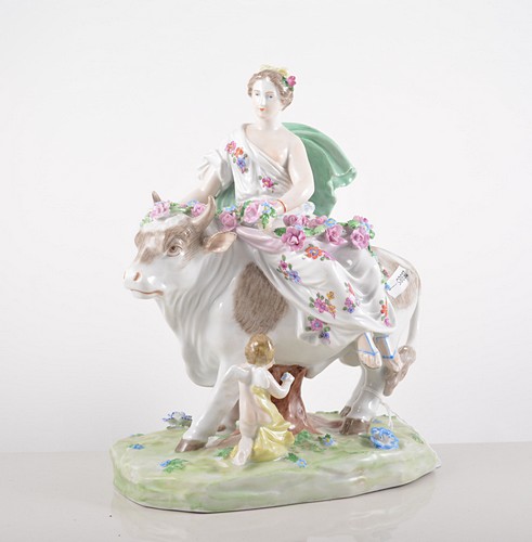modern figure with billowing cloak and rose festoons, attended by cherub, 26cm
