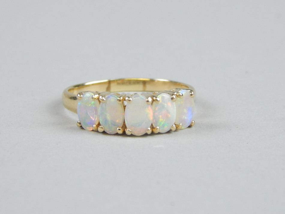 A dress ring, set with five moonstones, yellow metal, marked 14k, 3.1g all in