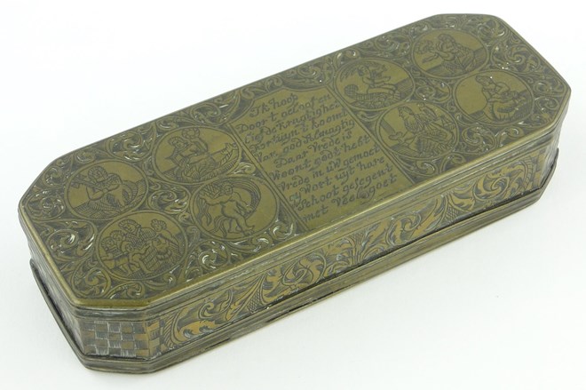 A Dutch engraved brass tobacco box, with engraved panel of text and armorial crest under base, length 6''.