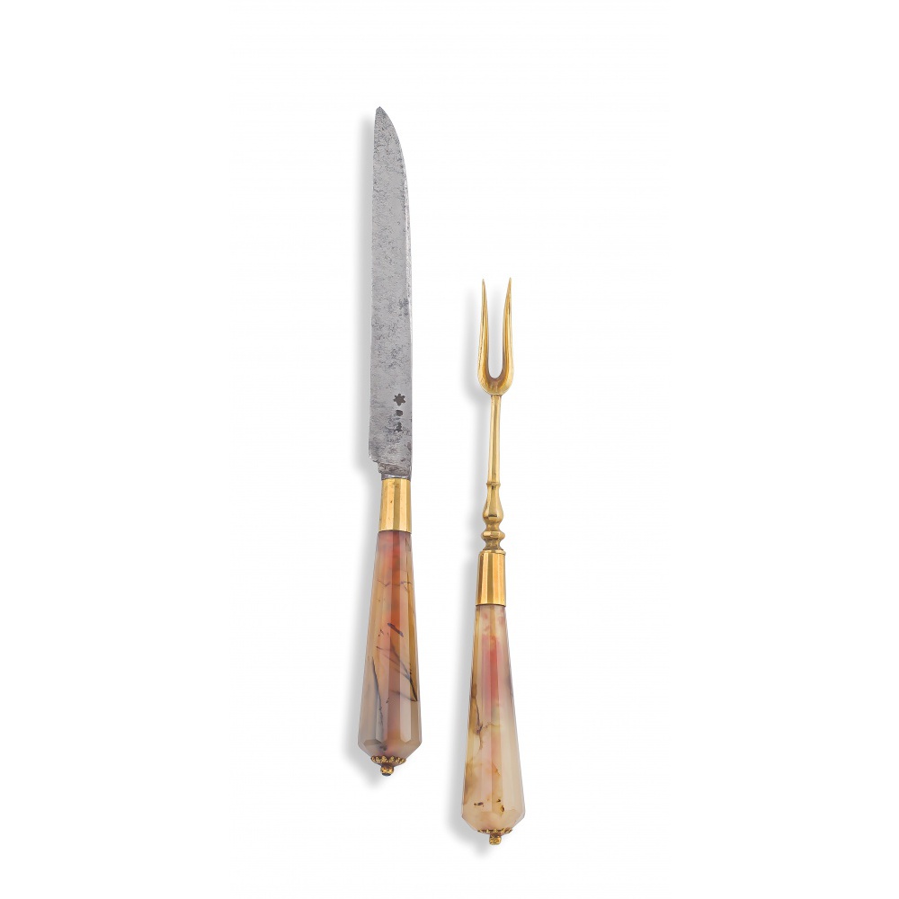 A Dutch shagreen-cased 18ct gold-mounted agate travelling dessert knife and fork, 18th century