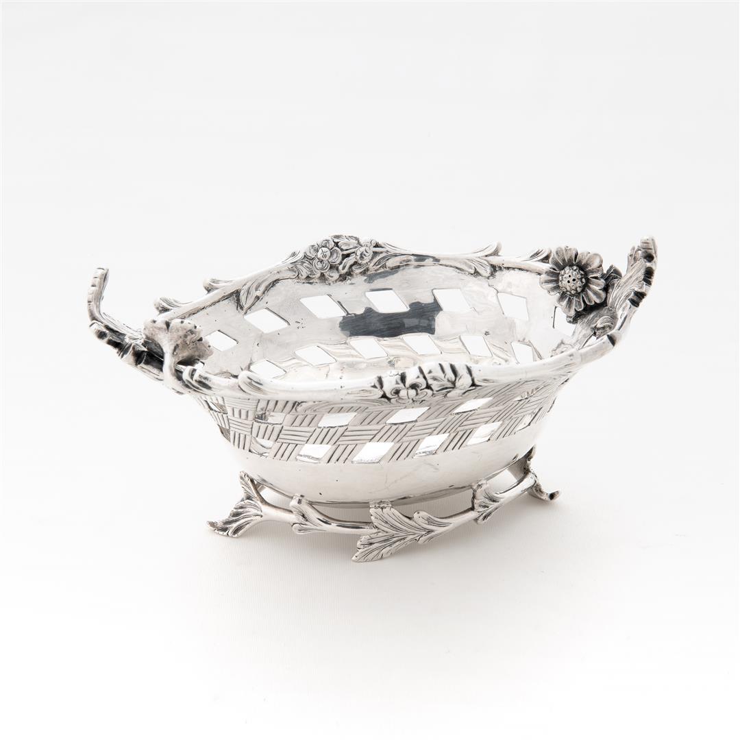 A Dutch silver Louis XV-style sweetmeat basket Circa 1900, marks unclear, also marked with ZII The small basket is modelled as a wickerwork basket, standing on a floral foot and the rim with floral ornaments, it has two floral handles. W. 14.2 cm Wei