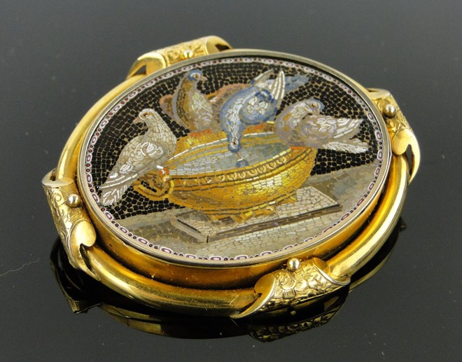 A fine 19th century micro mosaic brooch, depicting pliny's doves, in unmarked engraved and scrolled gold frame, width 49mm.