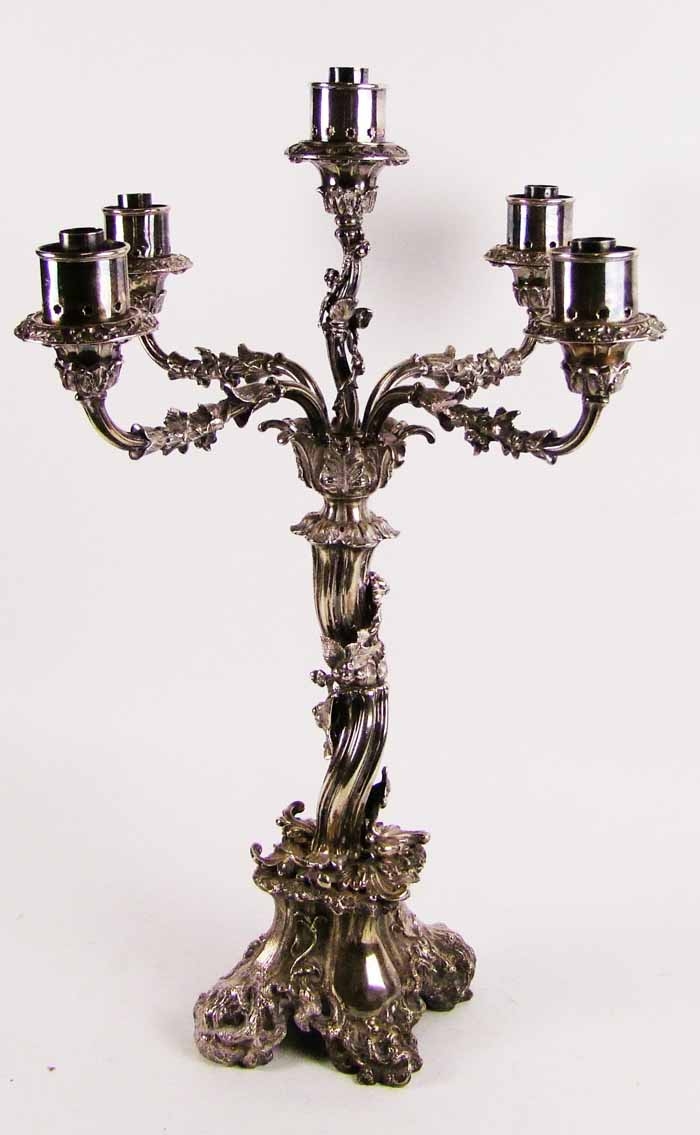 the base richly cast with roots and leaves, the four removable branches and centre support with screw-in candle holders