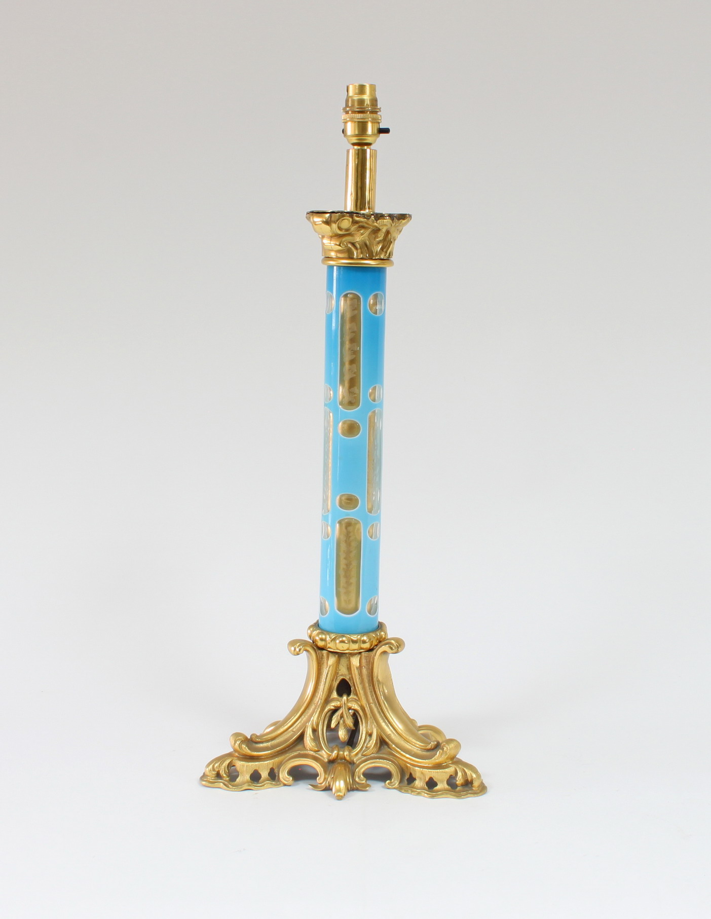 A French 19th Century gilt metal and blue overlay glass table lamp