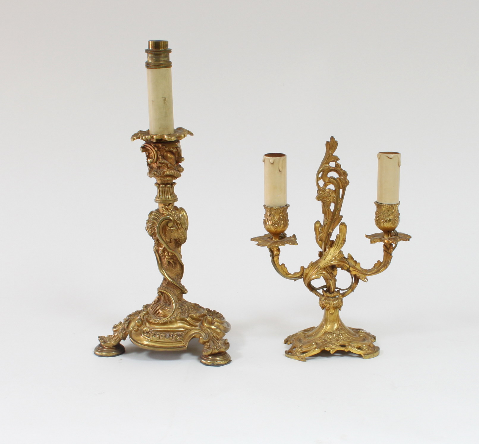 A French 19th Century ormolu twin-branch candelabrum in the Rococo style with scrolling acanthus leaf branches