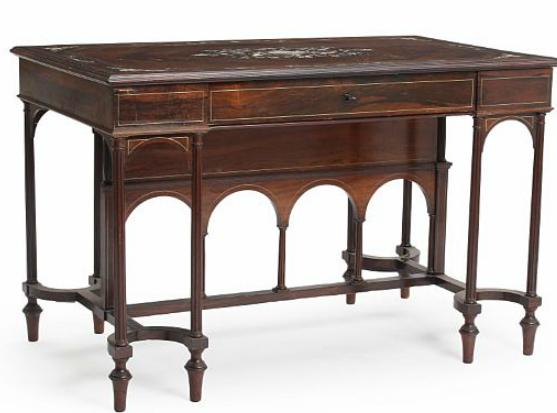 A French 19th century rosewood desk, top richly inlaid with dragons, insects and foliage, lock signed Fichet Paris