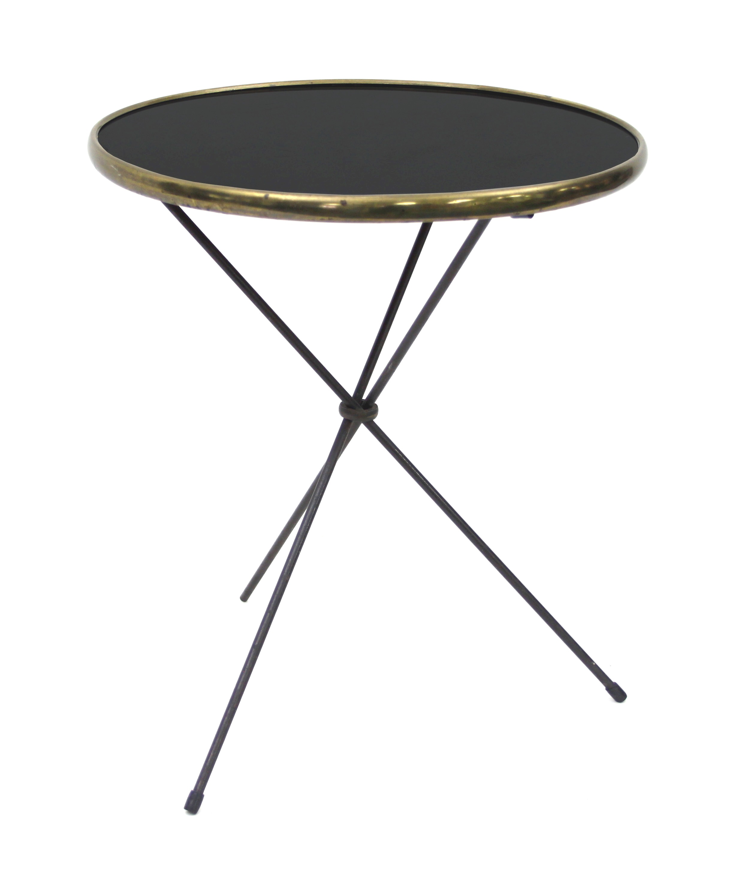 A French Art Deco style occasional table with circular black top within a brass rim on collapsible tripod base