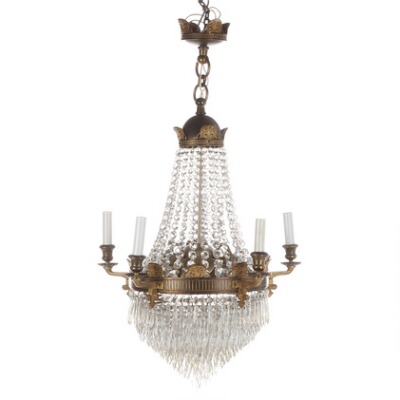 A French Art Nouveau cut glass chandelier with bronze frame, five branches, inside three internal