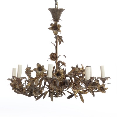 A French bronze- and brass chandelier, cast with foilage and flowers, eight branches. 19th century. H. 80. Diam. 72 cm.