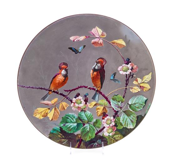 finely painted with cardinals and butterflies against a platinum ground.