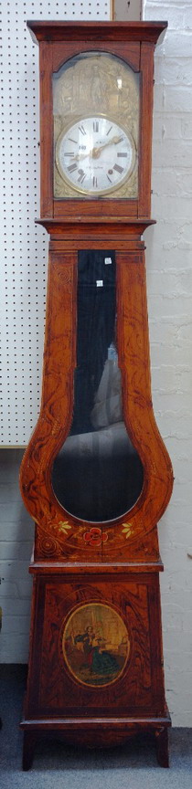 the white enamel dial detailed 'James Lebret a Emoutiers' over a shaped and painted pine case with glazed pendulum aperture