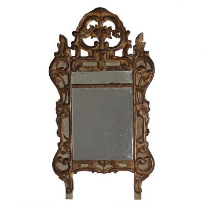 A French early 18th century painted and bronzed Regence mirror with openwork carvings