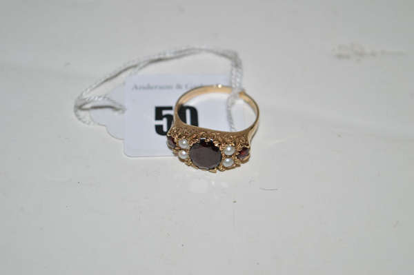 A garnet and half pearl set ring, in Victorian style scrolling mount, 9ct. shank, ring size Q.